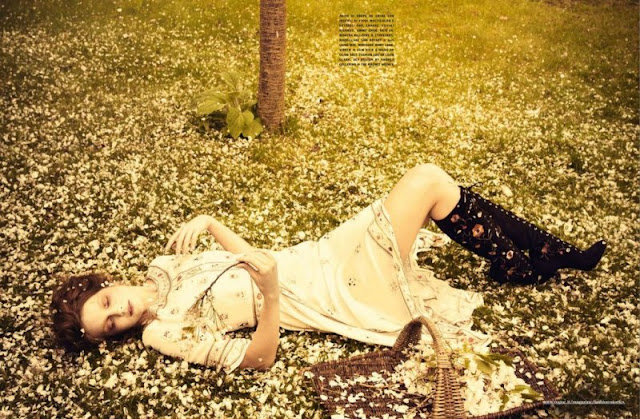 So Full of Dreams – Captured by Ellen von Unwerth, Hungarian beauty Eniko Mihaliktakes to the woods for this enchanting story featured in Vogue Italia’s July issue. Eniko dons a wardrobe of lightweight dresses and sparkling jewelry from Chanel selected by stylist Leith Clark. / Hair by Samantha Hillerby, Makeup by Sam Bryant, Set design by Andrea Cellerino.